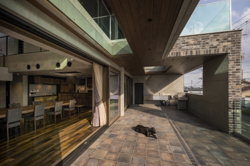 1階は、吹き抜けのエントランスホールとご主人の趣味のためのスペースを兼ねた広いガレージに。大きな吹き抜けが印象的な2階と3階の居住空間は、4つのフロアが連続するリビング・ダイニングを中心に構成し「一つ屋根の下に住む」という家族の一体感の醸成を意図しています。屋上には、360度の眺望が楽しめるコンクリート住宅ならではの魅力的な空間を設けました。